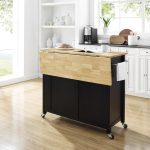 Transitional design Solid wood countertop with a natural finish Black finish Genuine metal hardware in a brushed nickel finish Two large cabinets with adjustable shelves Cabinet doors have magnetic closures Two storage drawers on roller glides Includes towel bar in a brushed nickel finish Built-in spice rack Built-in paper towel holder Finished back Includes four caster wheels with two that lock Caster wheels can be removed for use as a stationary island Drop leaf counter extension creates extra counter space for dining or food prep Overall height without casters is 34.5″ Pairs well with modern, minimalist, traditional, and farmhouse decor Each shelf has a weight limit of 20lbs Single drawers have a 15lb weight limit Countertop weight limit is 100lbs